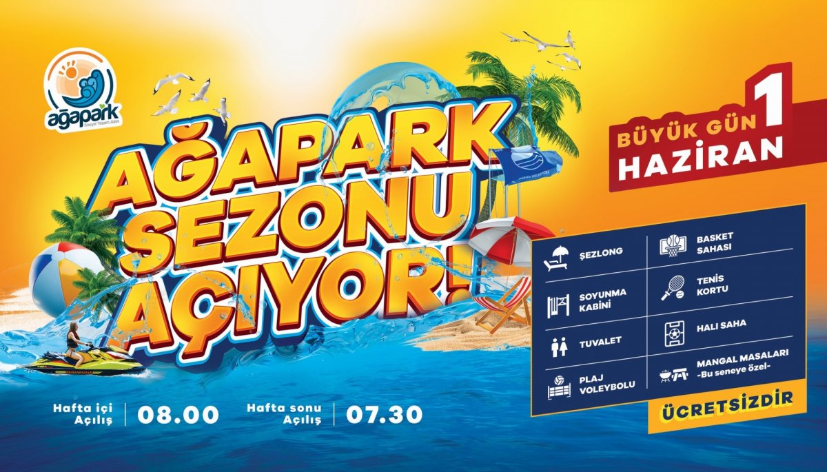 Mavi bayraklı plajı, 850 metre uzunluğundaki kumsalı, prestijli restoran ve kafelerinin yanı sıra spor ve sosyal donatı alanlarıyla Kuzey İzmir’in en gözde tatil rotaları arasında bulunan Ağapark’ta tatil sezonu 1 Haziran’da açılıyor.Aliağalıların olduğu kadar çevre ilçelerde yaşayan vatandaşların da günübirlik tatil tercihleri arasında yer alan Ağapark’ın geçen yaz olduğu gibi bu yaz da binlerce kişiyi misafir etmesi bekleniyor.170 dönümlük faaliyet alanında maviyle yeşili bir arada sunan, İzmir’in mavi bayraklı plajlarından Ağapark’ta, vatandaşlar gündüzleri güneş ve denizin, akşam saatlerinde ise gün batımının eşsiz manzarasını doyasıya yaşayacak.Hafta içi saat 08.00, hafta sonu ise 07.30’dan itibaren hizmet vermeye başlayacak olan Ağapark’ta, tatilciler tesis içerisindeki şezlong, soyunma kabini, tuvalet, spor sahaları ve piknik alanlarından da ücretsiz faydalanabilecek.